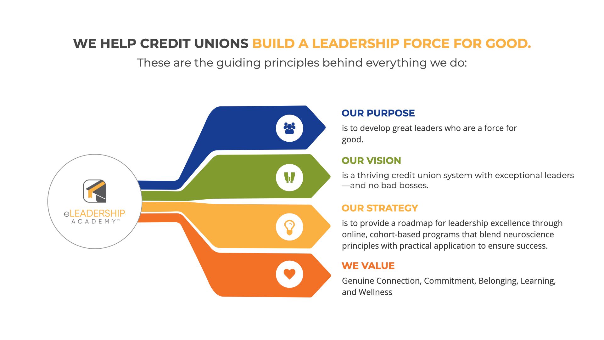 The future of the credit union system depends on great leadership. Exclusive to credit unions, eLeadership Academy® is the only online training solution that provides accessible, actionable training to develop high-performance CU leaders that people love to follow. We are on a mission to help build leadership and coaching bench strength within the system because we know credit unions are a force for good, and their leaders are the catalyst for member and employee experience.